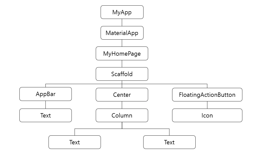 위젯은 트리 구조로 구성되어 있다. 이것을 위젯 트리(Widget Tree)라고 한다. 앞선 카운터 데모 앱의 위젯 트리는 다음과 같다.