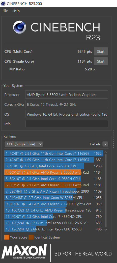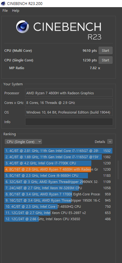 한편으로는 멘붕이 왔다. 메인으로 사용 중인 노트북도 시네벤치를 돌려보니 서브로 장만한 노트북보다 벤치 점수가 낮았기 때문이다.