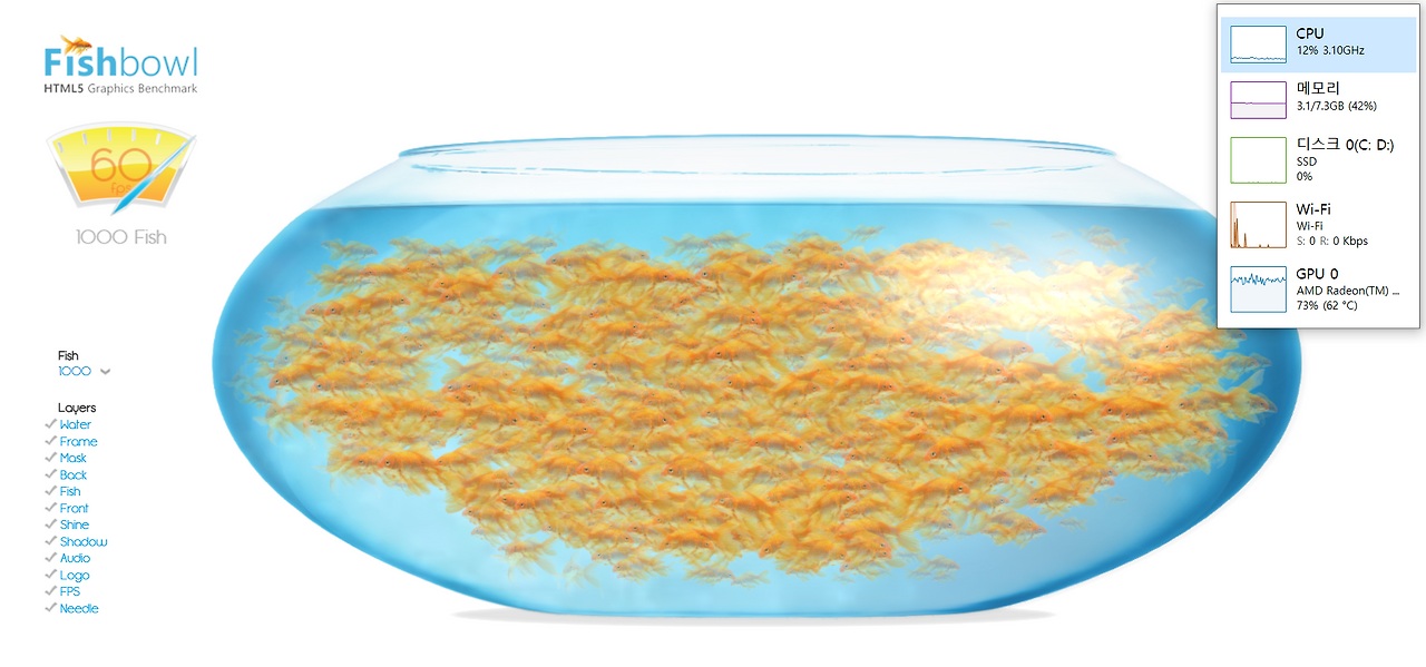5700U는 물고기 1000마리 고정 시 60 프레임을 유지했고 GPU 사용률이 70% 대다.