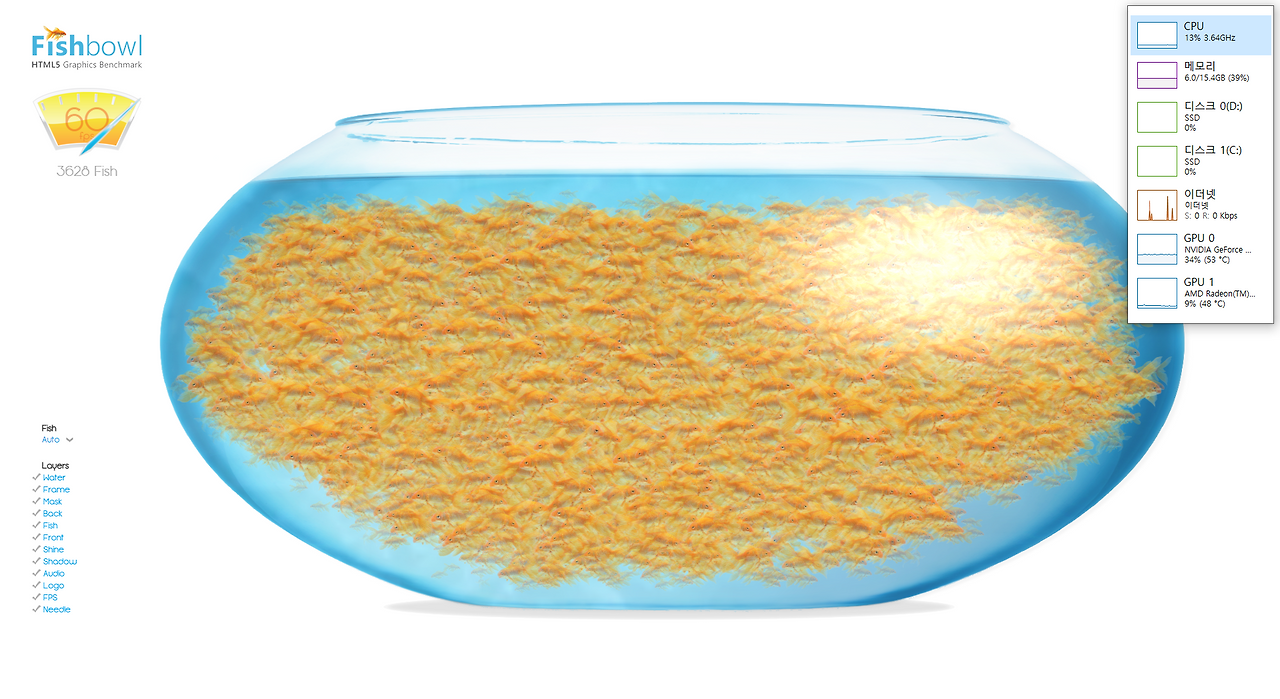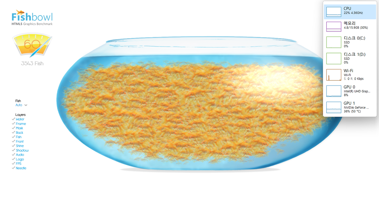 그래픽 테스트는 벤치 프로그램이 아닌 나름 유명한 fishbowl 사이트를 통해서 간단하게 확인했다.