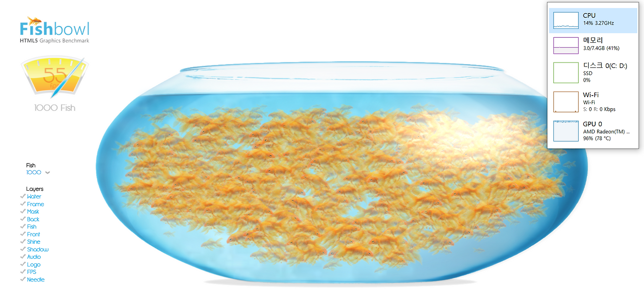 5500U는 물고기 1000마리 고정 시 55 프레임 정도를 유지했는데 GPU를 거의 풀 로드하고 있다.