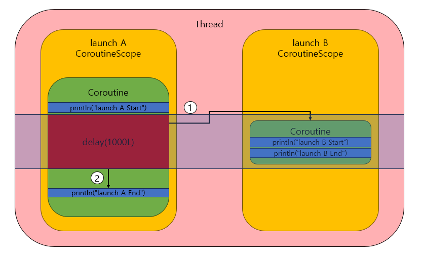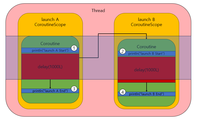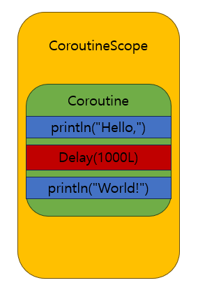 - 코루틴의 delay 함수는 지정한 시간만큼 코루틴을 일시정지 한다.