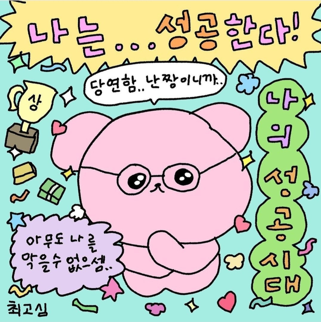 이런 긍정적인 에너지를 느꼈을 때 최고심은 성공할 수밖에 없다고 생각했다. 때때로의 좌절은 필수불가결한 요소이다. 중요한 것은 그것을 극복하는 마음이다. '무한한 긍정 자신감 -> 좌절 -> 다시 일어서기' 이 과정을 모두 담고 있다. 실제로 최고심 작가가 어떤 사람인지는 모른다. 하지만 최고심 짤에 담는 생각을 평소에 가지고 있는 분이라면 '뭘 해도 성공할 사람이 아닐까'라고 종종 생각한다.