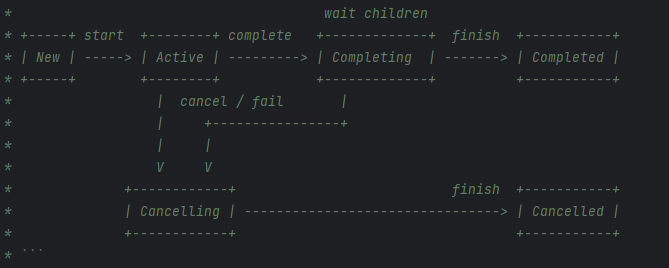 이런 것들을 좀 더 추상화시킬 수 없을까? 취소, 완료 이런 것들을 좀 더 추상적인 표현으로 바꾸면 무엇으로 바꿀 수 있을까? 상태라고 할 수 있다. 이렇게 상태를 제어하는 역할을 하는데 혹시 확인하는 역할을 못할까? 한다. Job.kt 내부에 주석으로 설명된 내용을 보면 다음과 같이 크게 여섯 가지 상태를 가진다. 그리고 세 가지 프로퍼티에 각 상태에 따른 특정한 값이 할당된다.
