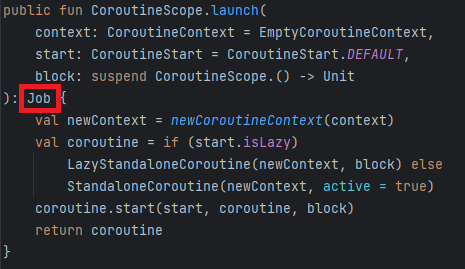 일단 놀랍게도 여기까지 오는 동안 Job을 몇 번이나 만들었다. Job은 코루틴 빌더인 launch를 통해 생성된다. 그러니까 launch를 작성했을 때마다 생성되었다는 것이다. launch의 구현부를 보라. 리턴 타입이 Job이다.
