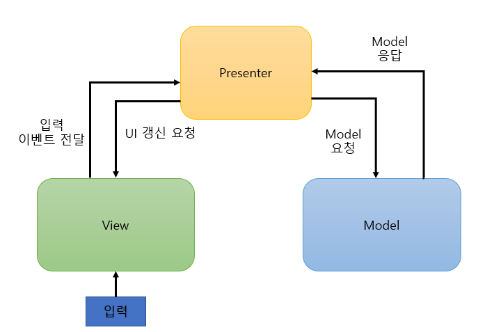 하지만 이러한 관점은 MVP 패턴에서 바뀐다. 안드로이드 MVP 패턴에서 Activity는 뷰로 취급된다. 안드로이드에서 뷰를 그리기 위해선 안드로이드 시스템에 해당 작업을 요청해야 한다. 따라서 안드로이드 시스템에 의존성이 큰 Activity는 컨트롤러 보단 뷰에 더 가깝다고 생각할 수 있다. 뷰를 그리는 작업은 안드로이드 의존성을 끊고 할 수 없지만 컨트롤러의 역할은 가능하기 때문이다.