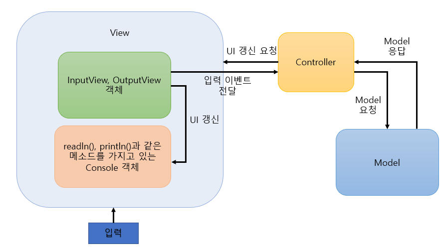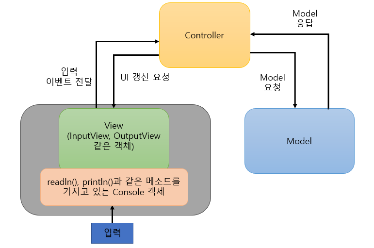 먼저 안드로이드가 아닌 콘솔 프로그램을 기준으로 생각해 보자. 위 MVC 구조를 콘솔 프로그램 기준으로 좀 더 세분화해 보면 다음과 같이 나타낼 수 있지 않을까?