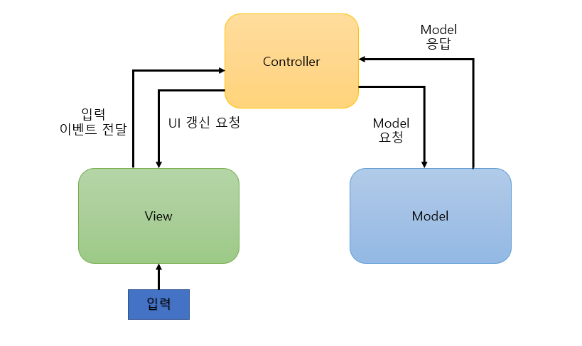위 구조는 MVC 패턴을 나타낸 것이다. Controller(이하 컨트롤러)에 의해서 View(이하 뷰)와 Model(이하 모델)가 소통하는 구조로 되어 있어서 뷰와 모델의 의존성을 제거할 수 있다. 이렇게 분리하면 각각의 책임이 명확해진다. 코드 설계를 이해하기 쉬워지고 그만큼 유지보수에도 용이하다. 또한 분리가 잘되어 있을수록 테스트하기 쉬워진다.