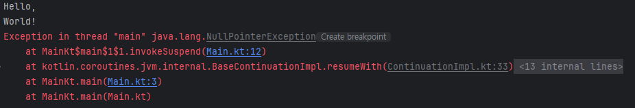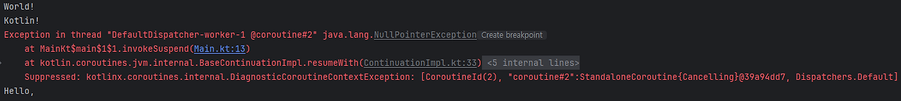 NullPointerException이 발생했다. (다만 예외가 서로 다른 스레드에서 발생하고 있다는 차이점이 있다. 이것은 코루틴 디스패처를 알고 있다면 이해할 수 있다.)