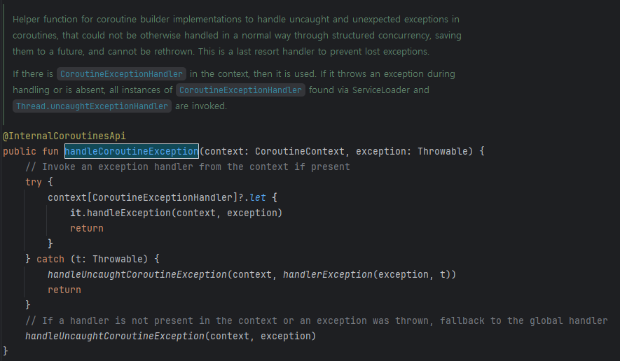 CoroutineExceptionHandler의 동작 원리를 알아보기 위해서 CoroutineExceptionHandler.kt 파일을 살펴보자. 해당 파일에는 handleCoroutineException 메서드가 존재한다. 해당 메서드는 예외 처리 중에 또 다른 예외가 발생하거나 CoroutineExceptionHandler가 컨텍스트에 존재하지 않을 때 JVM 환경에서는 ServiceLoader를 통해 발견된 모든 CoroutineExceptionHandler 인스턴스와 Thread.uncaughtExceptionHandler가 호출된다.