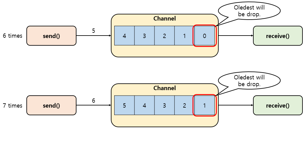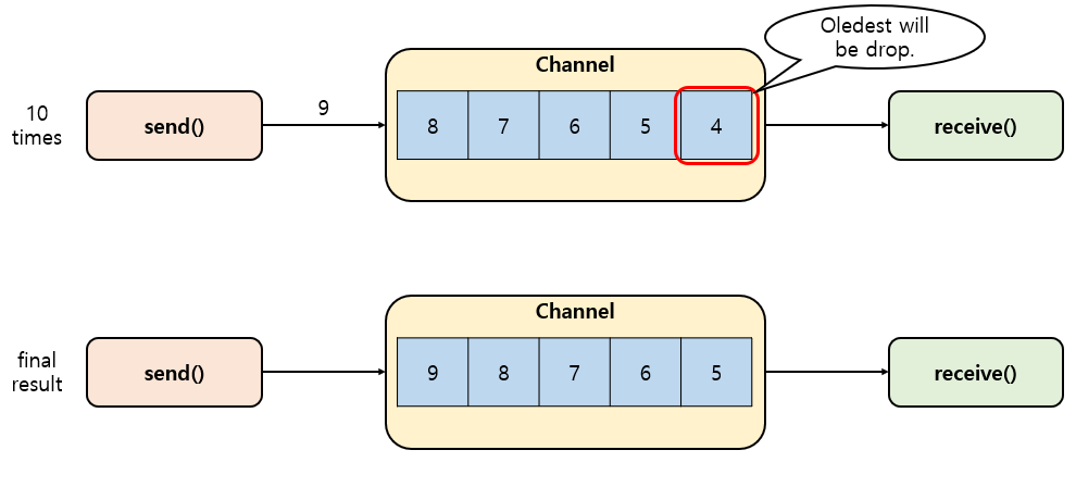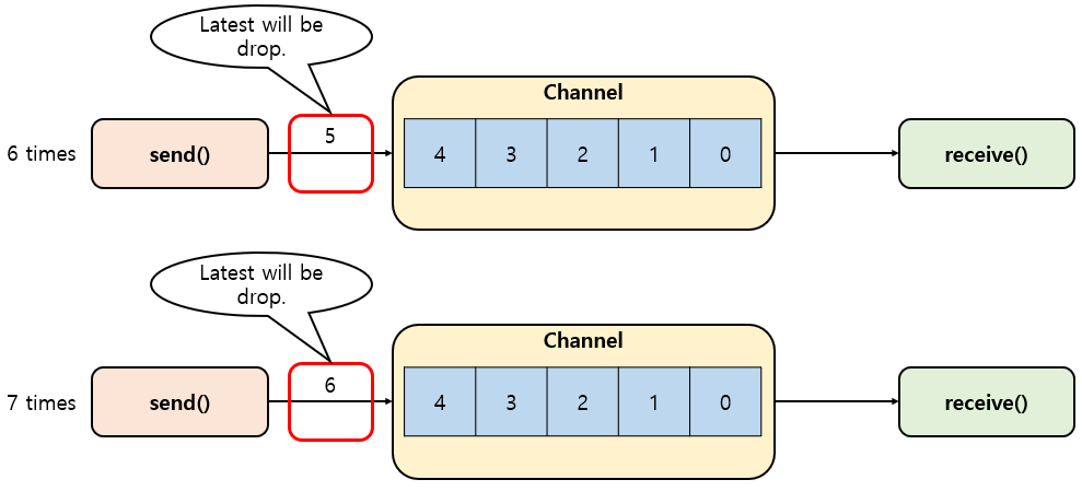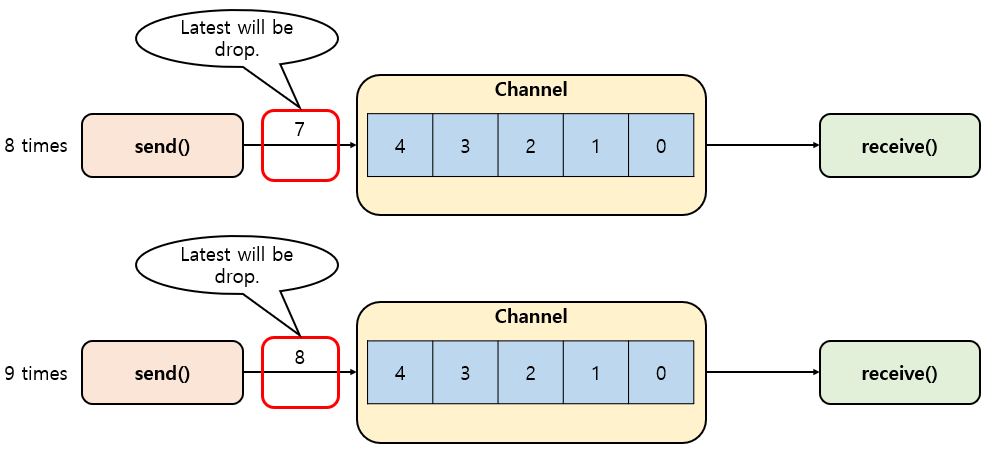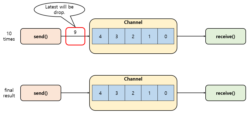 - DROP_LATEST: 버퍼 오버플로우 시 버퍼에 추가를 시도하는 가장 최신 값을 드롭한다. 즉, 새롭게 전송되는 값을 버퍼에 추가하지 않는다. 따라서 버퍼 내용이 변경되지 않는다. 중단하지 않는다.