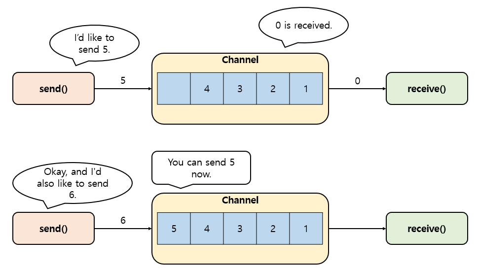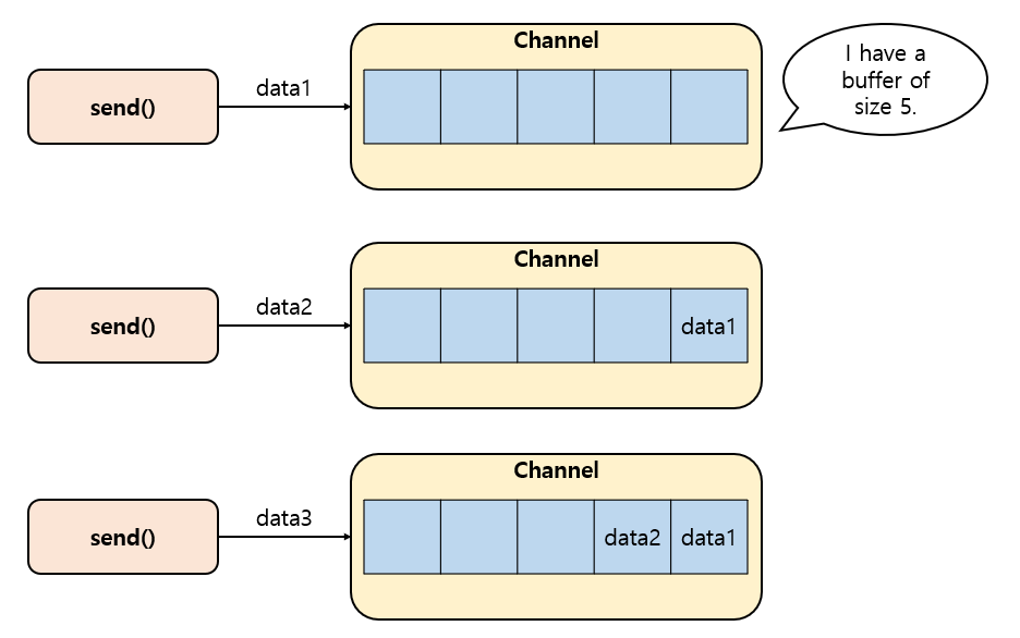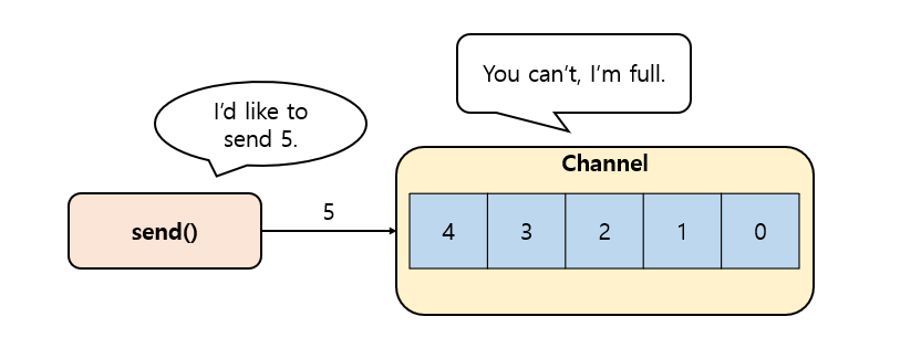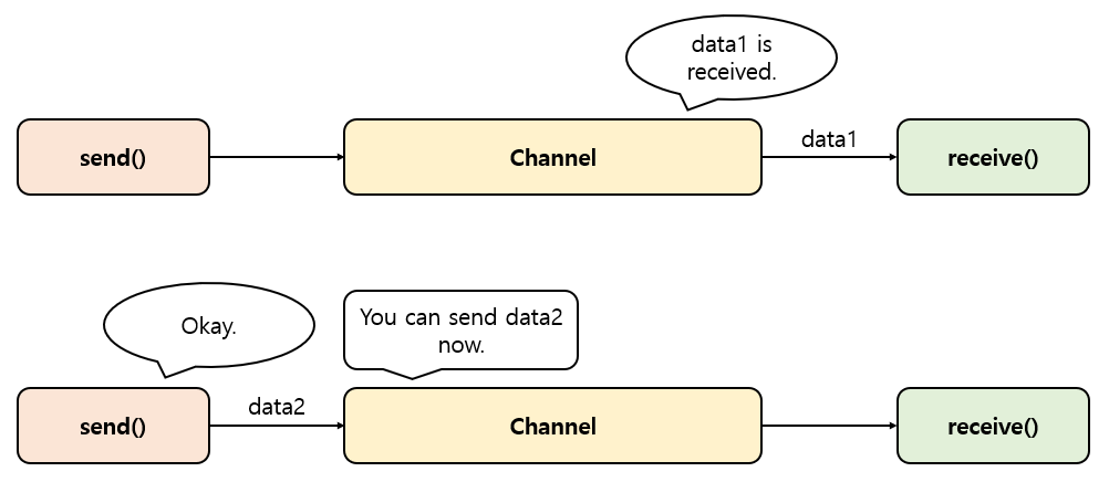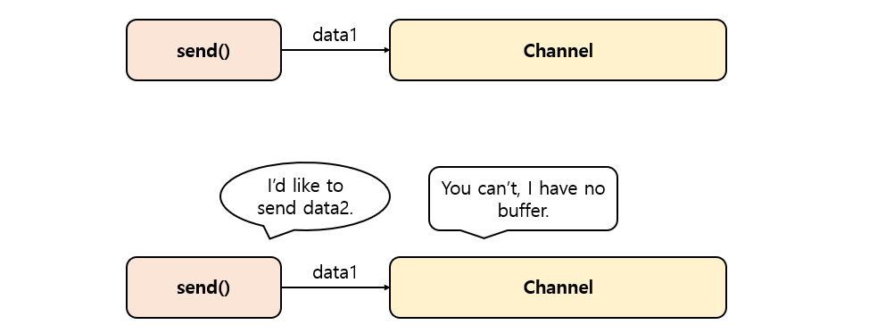 send()가 data1이라는 값을 전송한다. send()는 해당 값이 수신되지 않은 상태에서 data2라는 값을 전송하려고 시도한다. 채널은 기존에 전송하려고 시도 중인 data1에 대한 데이터를 보관할 버퍼가 없기 때문에 send()의 요청을 처리할 수 없다. send()는 data1이 수신될 때까지 기다려야 한다.