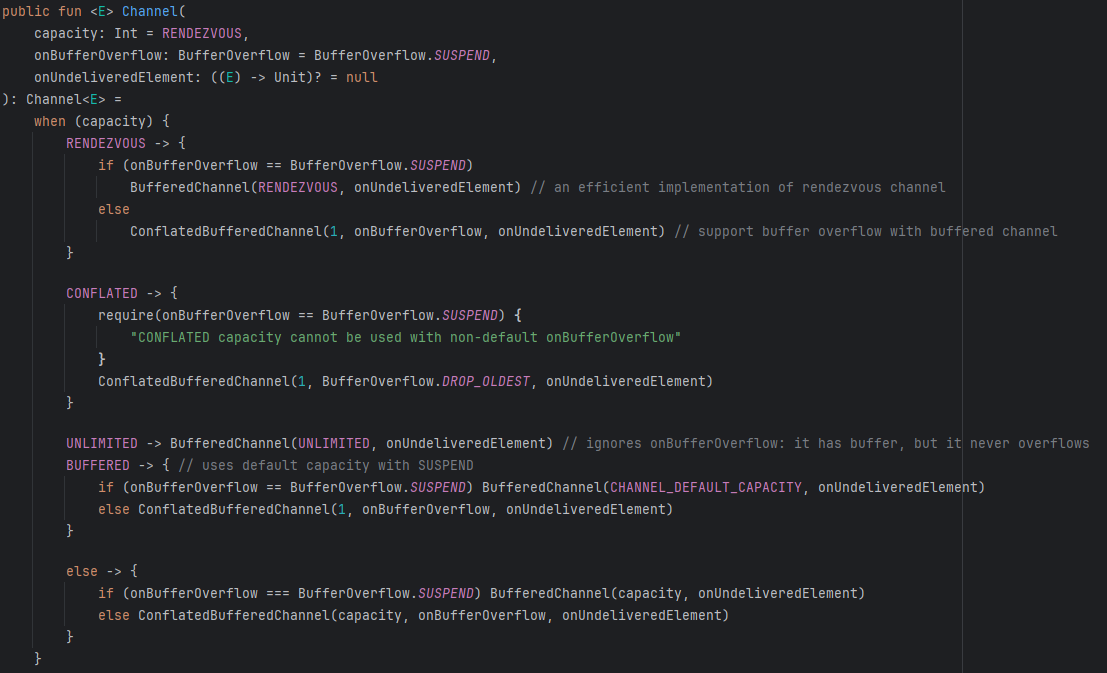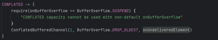 이 두 채널은 결국 동일한 동작을 하는 채널이다. CONFLATED 채널을 생성하는 코드를 자세히 보면 내부적으로 결국 위 코드 중 후자의 형태를 띠고 있는 것을 알 수 있다.