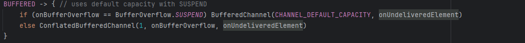 BUFFERED 채널의 내부 코드를 보면 onBufferOverflow가 SUSPEND인 경우에는 크기가 기본값으로 설정된다. 이때는 버퍼 오버플로우 시 중단되기 때문에 별도로 onBufferOverflow를 설정할 필요가 없다.