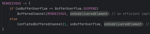 RENDEZVOUS 채널을 생성하는 코드를 보면 onBufferOverflow가 기본값인 SUSPEND일 때는 onBufferOverflow에 대한 설정 없이 BufferedChannel(RENDEZVOUS, onUndeliveredElement)을 통해서 채널이 생성된다. 이유는 RENDEZVOUS 채널이 버퍼를 사용하지 않기 때문이다. 버퍼를 사용하지 않으니 버퍼 오버플로우가 발생할 수 없다. 그러므로 onBufferOverflow 파라미가 필요하지 않다. 처음 채널을 다룰 때 사용했던 형태이다. SUSPEND가 아닐 때는 ConflatedBufferedChannel(1, onBufferOverflow, onUndeliveredElement)를 호출한다. 이때는 버퍼가 존재하며 버퍼 크기는 1이다. 따라서 capacity를 Channel.Factory.RENDEZVOUS로 설정했다고 하여 무조건 버퍼가 존재하지 않는 것이 아님에 유의해야 한다.