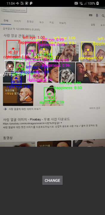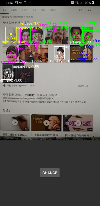 이 예제는 여러 명의 얼굴을 동시에 인식할 수 있다. 인식된 각 얼굴의 대략적인 위치와 크기를 사각형으로 표시해준다. 또한 좌우 눈을 뜨고 있는지 감고 있는지에 대판 판별, 웃고 있는지에 대한 판별, 각 얼굴에 대한 ID를 표시해준다.