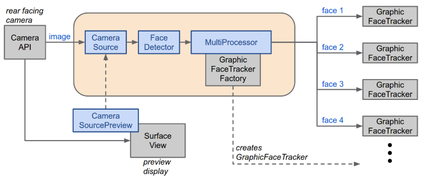 예제 코드에서 제공하는 GraphicFaceTrackerFactory를 사용하여 필요에 따라 새로운 face tracker 인스턴스를 만든다. (참고 : MultiProcessor는 임의의 수의 탐지된 항목(얼굴)을 처리하기 위한 구성 요소다.)