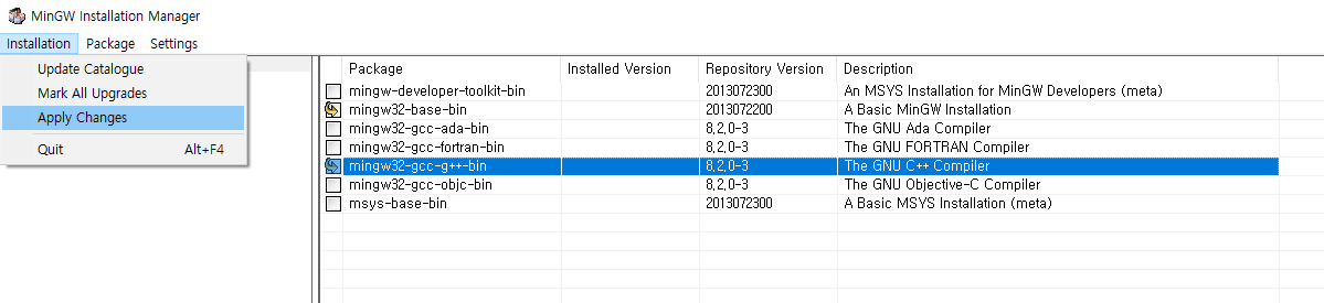 최초 화면에서 continue를 선택하고 아래 화면이 나오면 mingw32-base-bin과 mingw32-gcc-g++-bin을 선택하고 메뉴에서 Installation-Apply Changes를 선택하면 설치가 진행된다.
