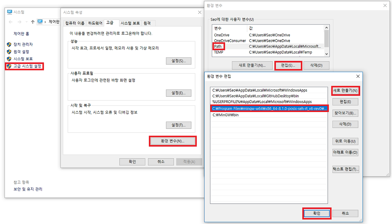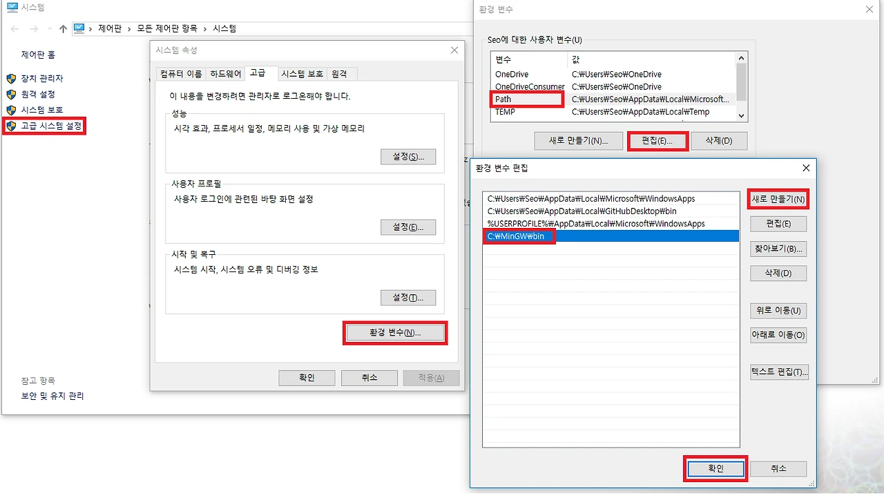 환경 변수 중에서 Path 변수에 MinGW가 설치된 경로의 bin 폴더 경로를 추가해 주면 된다.