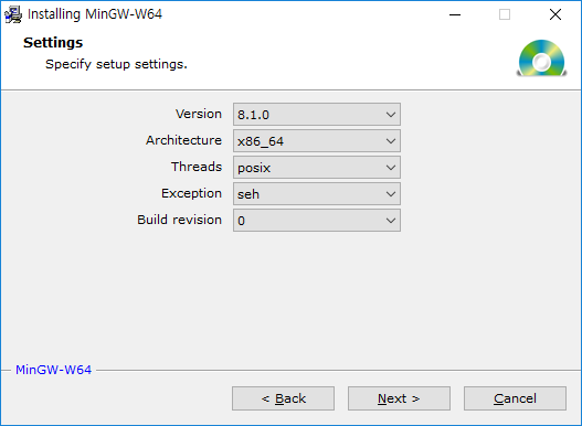 설치 진행은 next로 넘어가다가 다음 Settings 화면에서는 위와 같이 설정했다. Architecture는 사용하는 PC환경에 따라 설정하면 되는데, 앞서 말했듯이 64비트를 지원하는 게 목표이기 때문에 Architecture는 x86_64를 선택했다. Threads는 호환성이 더 높은 posix로 선택했다. 해당 설정에 대해 자세히 알고 싶다면 여기를 보면 이해할 수 있다.