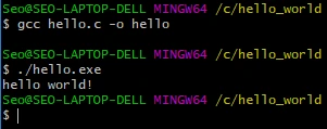MinGW 환경 변수 설정이 되어 있어서 곧바로 git bash에서 gcc 사용이 가능하다.