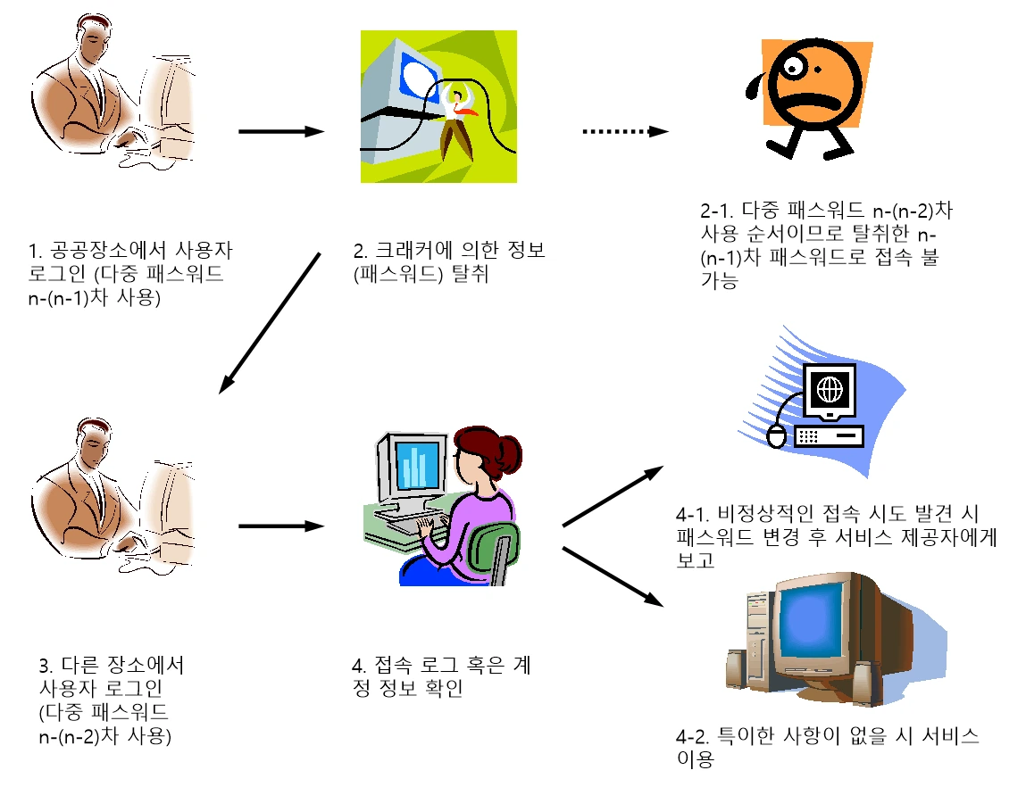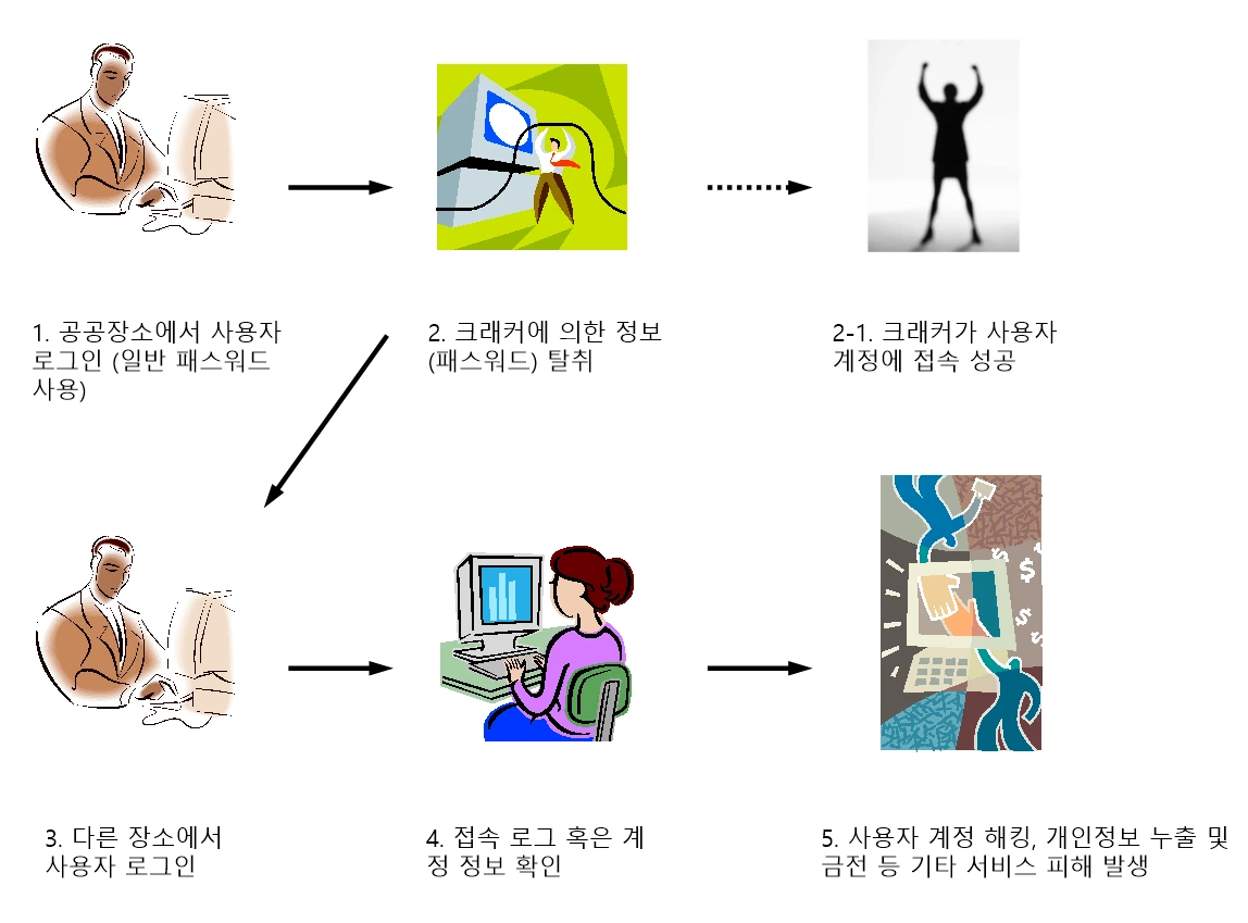 만약 일반적인 로그인 방법으로 단일 패스워드를 사용했다면 위와 같은 경우에서 해킹을 예방할 수 없고 패스워드 노출과 동시에 해킹의 피해를 입게 된다.
