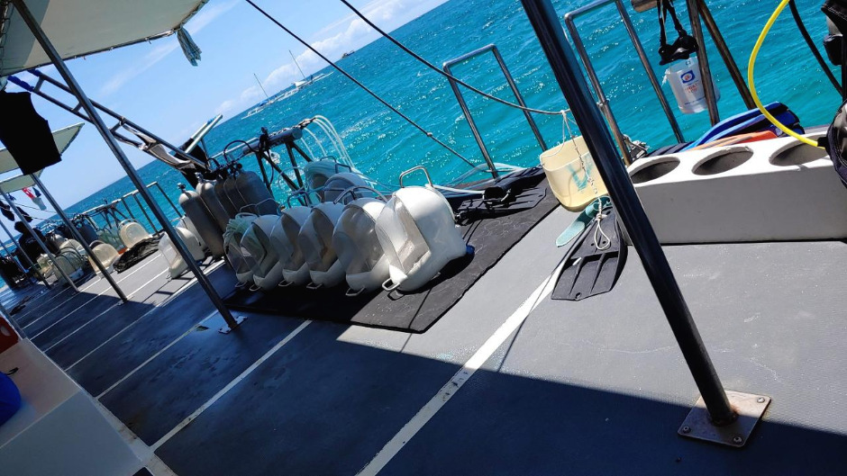 보트를 타고 바다 위에 있는 베이스캠프(?)로 이동했다. 여기서 주의사항과 몇 가지 수신호를 배운 후에 입수를 한다. 헬멧은 호스로 연결되어 지속적으로 산소가 공급되는 방식이고 앞의 손잡이를 잡고 있어야 한다. 산소가 들어오고 앞이 보이는 뒤집어진 양동이와 다를 바 없다.