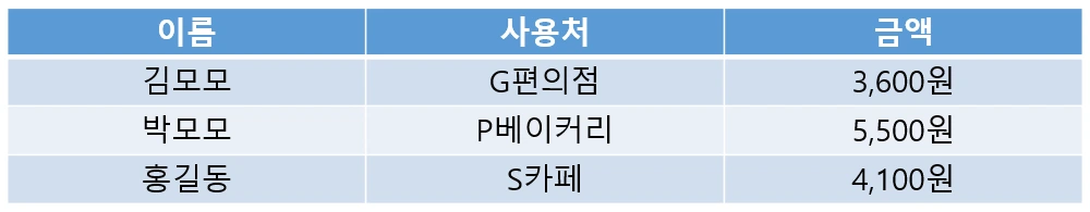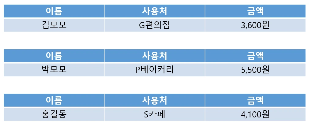 수많은 결제내역들이 위 표(table) 형태로 저장됩니다. 앱 알림을 위해서 앱은 로그인한 사용자 정보 중 이름을 바탕으로 데이터베이스에서 그 이름이 존재하는지 열심히 찾습니다. 홍길동이란 사람이 카드를 사용했다고 가정해 보죠. 그러면 이름이라는 열에서 하나씩 찾아봅니다.