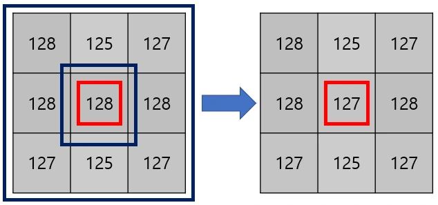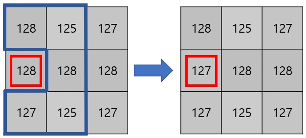 보정할 픽셀의 평균값을 구할 때는 경곗값에 주의해야 한다.