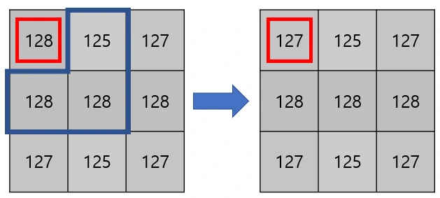 위 그림에서처럼 좌측 상단의 픽셀은 주변의 3개 픽셀의 평균값으로 보정한다.