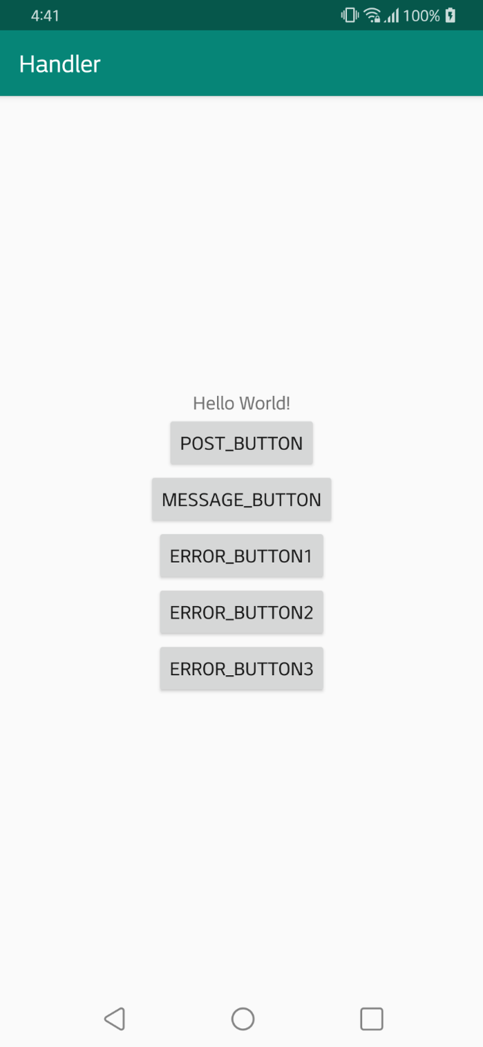 첨부파일은 핸들러를 사용한 UI 처리에 대해 알아보기 위한 간단한 예제이다. 실행을 하면 다음과 같은 화면이 나온다. 각 버튼을 누를 때마다 'Hello World!'가 적혀있는 textView의 문구를 변경하는 UI 작업을 한다. ErorrButton들은 워커 스레드에서 UI처리를 시도하도록 하여 다음과 같은 에러가 발생하여 앱이 종료된다.