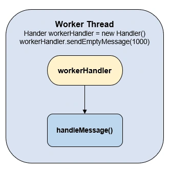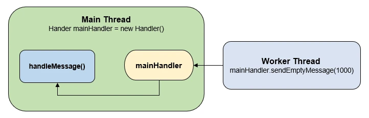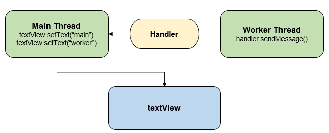 이런 문제를 해결하기 위해서 워커 스레드는 핸들러를 사용한다. 핸들러의 역할을 간단히 말하면 메시지를 전달하는 것이다. 워커 스레드에서 핸들러는 메인 스레드로 메시지를 전달한다. 그러면 메시지를 수신한 메인 스레드에서 적절한 작업을 처리하는 것이다.