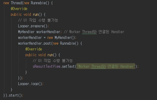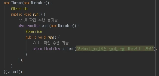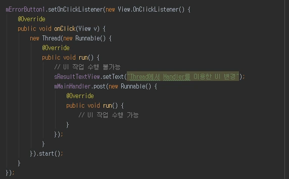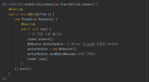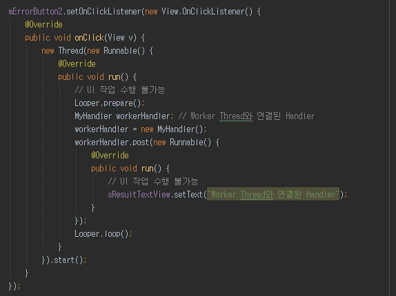앞서 post()에서 살펴본 비정상적인 UI 처리 코드이다. 워커 스레드 내에서 핸들러를 생성한다. 해당 핸들러의 post()를 통해서 실행된 run()에서 UI 처리를 시도하기 때문에 결론적으로 워커 스레드에서 UI 처리를 하려는 것과 같다. 에러가 발생한다.