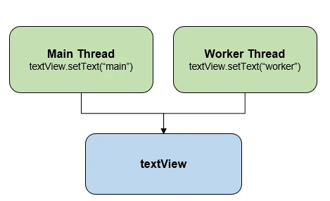예를 들어 다음과 같이 하나의 textView에 메인 스레드와 워커 스레드가 동시에 setText를 하려고 하면 문제가 된다. 적절한 갱신에 어려움이 생긴다.