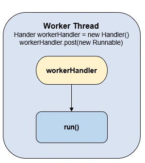 워커 스레드 내부에서 메인 스레드의 핸들러를 통해서 Runnable 객체를 전달한다. 따라서 메인 스레드의 Message Queue에 Runnable 객체가 저장된다. 그러면 메인 스레드의 Looper가 Runnable 객체를 꺼내서 run()을 실행한다. 메인 스레드에서 처리되는 UI 작업이기 때문에 정상적으로 실행된다.
