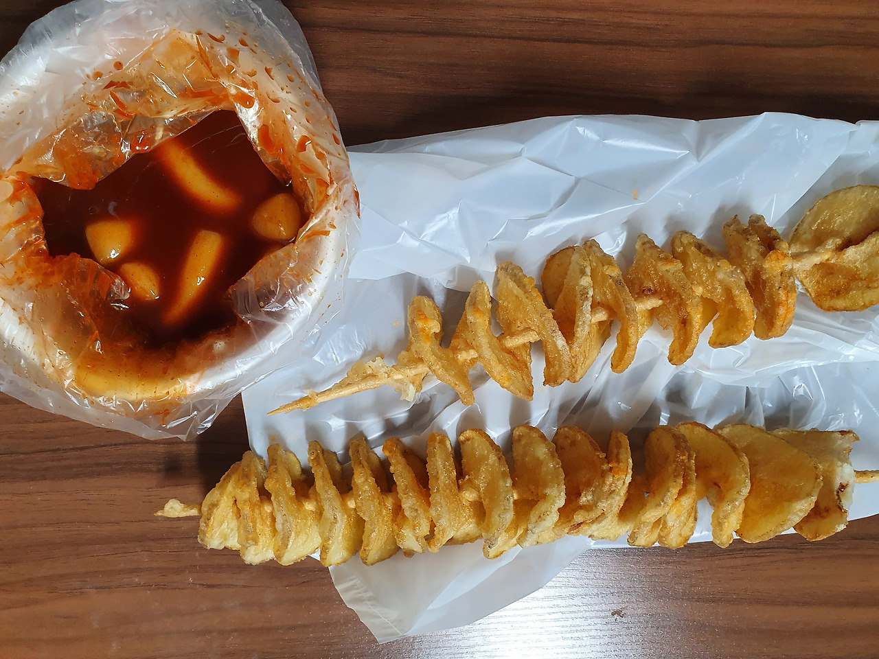 그렇게 미세먼지로 간이 된 떡볶이와, 미세먼지 소스가 솔솔 뿌려진 회오리 감자를 사 왔다. 역시나 먹는 순간 미세먼지의 존재를 잊어버릴만한 맛이었다. 마스크로 기관지로 유입되는 먼지는 원천 봉쇄했지만 입으로 들어오는 건 순순히 허용하고 말았다. 목구멍 단속은 역시나 쉽지 않다.