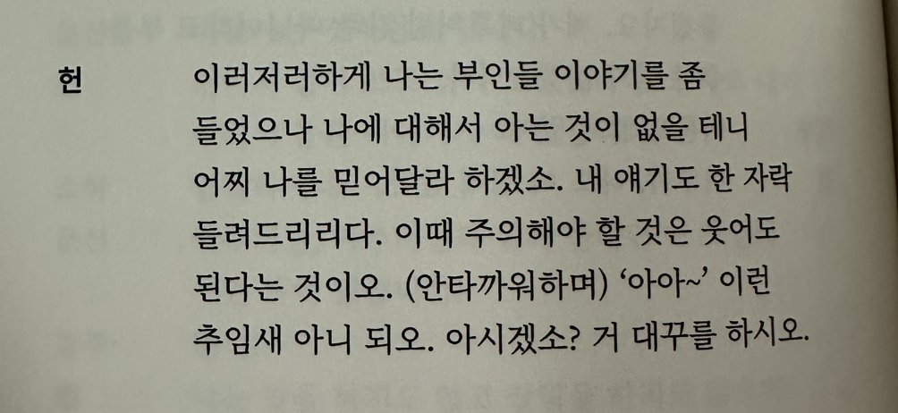 그때부터 조금 긴장을 풀고 신강수 배우님의 연기를 볼 수 있었습니다. 특유의 리듬감과 여유로움. 그리고 유머러스함이 너무 좋았습니다. 오랜 기간 홀로 별채에 방치되었으나 크고 맑은 영혼을 가진 헌이라는 존재가 꼭 눈앞에 있는 것만 같았습니다.