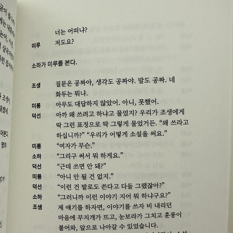 글쓰기는 우리의 내면을 돌아보게 하고, 또 동시에 ‘나’를 알아차리게 함으로써 가로막는 것을 부수고 나아가게끔 해주기도 하지요. 이 연극에는 그런 글쓰기가 갖는 의미와 힘이 잘 담겨 있어서 좋았습니다. 무얼 쓰느냐로 그 사람들의 삶을 이야기하다니!