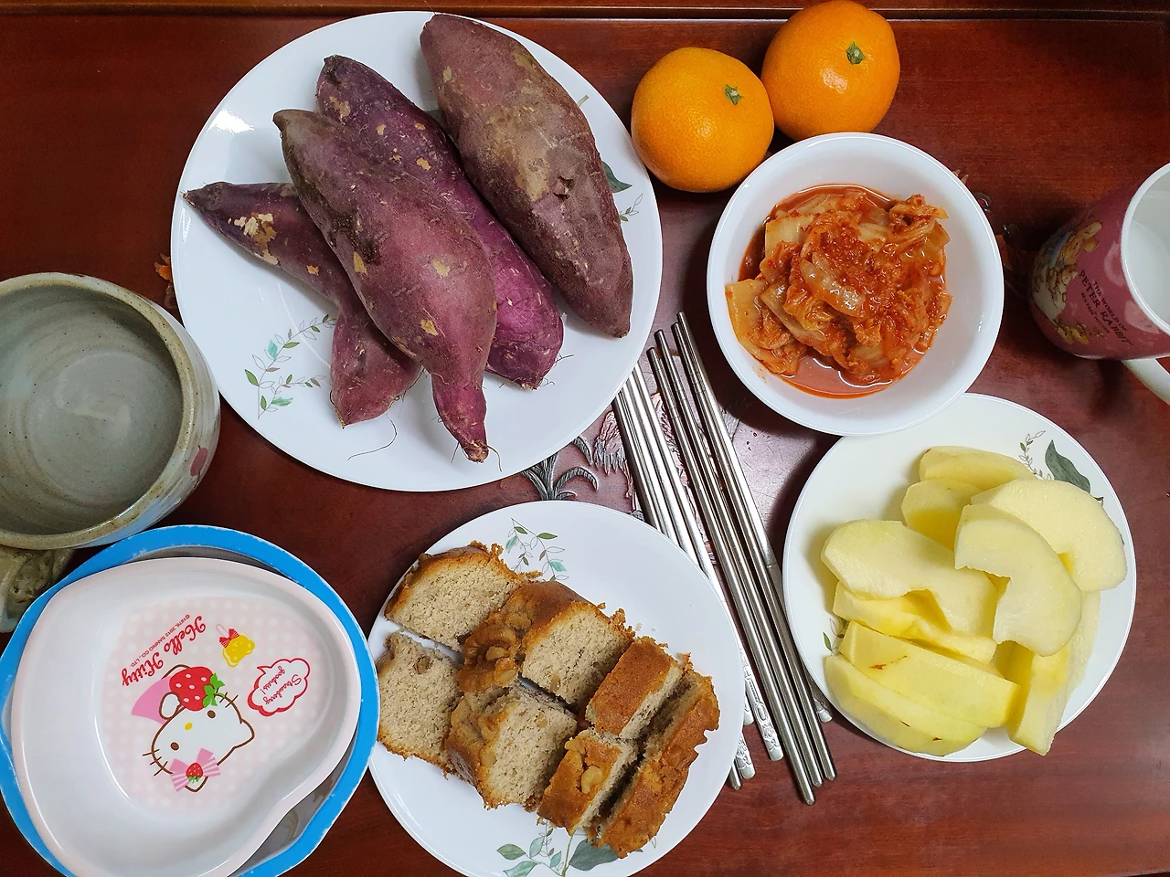 주말 아침, 간단하게 아침을 먹기 위해 오븐에 고구마를 넣어놓고 동네 뒷산에 다녀왔다. 그 새 먹기 좋게 익은 고구마 냄새가 고소하게 집안에 퍼진다. 아들은 역시나 '김치 많이 주세요'라고 주문을 하고, 나는 미처 준비하지 못한 우유의 부재가 아쉽다.