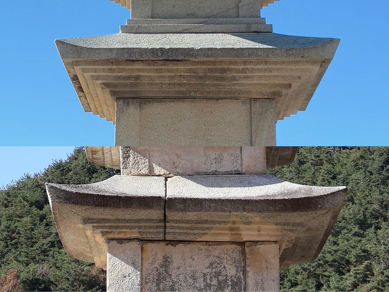 두 번째 기준은 옥개받침이다. 위 사진의 석탑은 옥개받침이 다섯 단으로 구성되어 있는 반면, 아래 사진의 석탑은 세 단에 그친다.