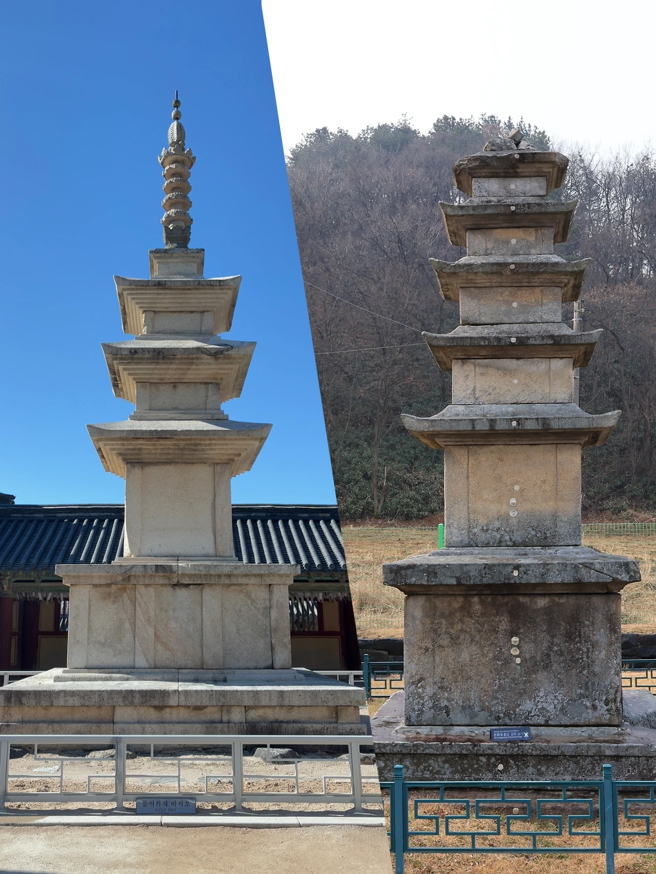 마지막 기준은 전체적인 비례다. 왼쪽 사진의 석탑은 기단-탑신-상륜부로 이어지는 비율이 3–2–1의 느낌으로 전체적으로 안정적이고 조화로운 인상을 준다.