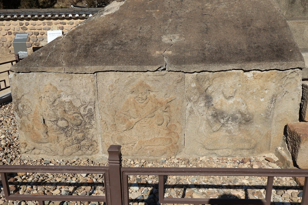 기단 면석에는 팔부신중상이 새겨져 있다. 한 면에 여섯 구씩 배치되어 있고, 정면에는 계단이 놓여 있다. 보통 여덟 구로 구성되는 경우가 많다는 점을 생각하면 조금 다른 모습이다. 처음부터 여섯 구였는지, 아니면 일부가 사라진 것인지는 알 수 없지만, 그 차이만으로도 이 탑의 독특함이 느껴진다.