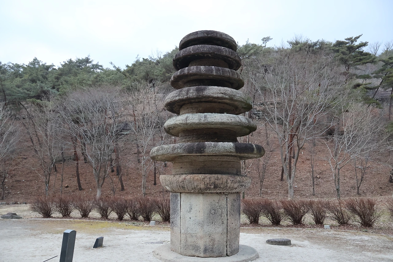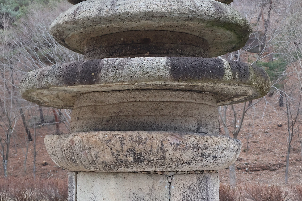 원형의 지대석 위에 다섯 개의 면석이 원기둥 형태를 이루고, 그 위에는 연꽃 모양의 돌이 갑석으로 놓여 있다.