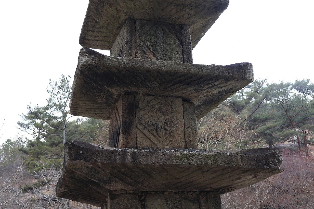 걸어가는 길 중간에도 석탑 한 기가 놓여 있다. 단층기단 위에 별석으로 우주를 만든 초층 탑신이 놓여 있고, 그 위로는 마름모꼴과 X자 문양이 새겨진 탑신들이 이어진다. 어디에서도 쉽게 볼 수 없는 독특한 장식이다.