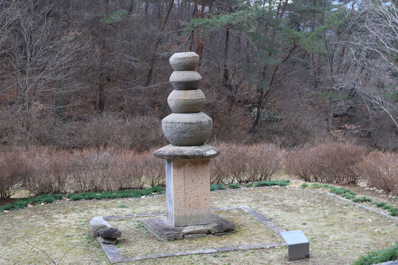 층단이 표현된 기단 위에 세 장의 판석으로 이루어진 탑신이 놓여 있고, 그 위로 원형의 갑석으로 보이는 부재와 구형의 탑신으로 추정되는 석재 네 개가 중첩되어 올려져 있다.