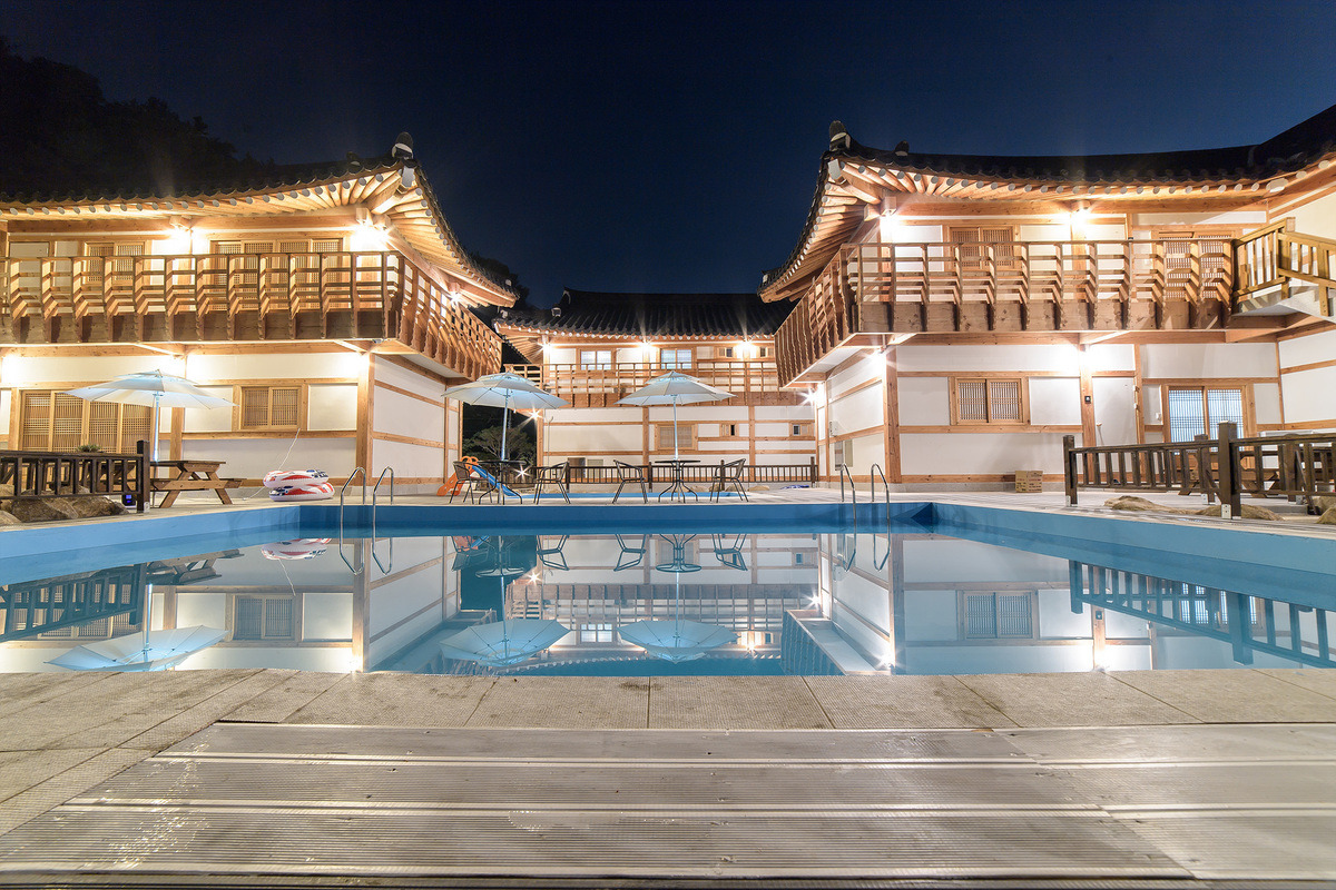 최근 나혼자 산다 경주편을 촬영했던 숙소가 바로 이곳, 한옥펜션 더 나인펜션 이다. 넓은 야외수영장과 한옥 스타일의 멋스러운 외관이 인상 깊은 펜션으로 2인실부터 최대 12인까지 숙박 가능한 대형룸도 보유하고 있다.