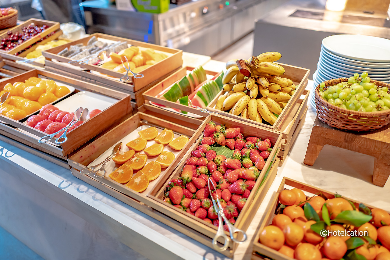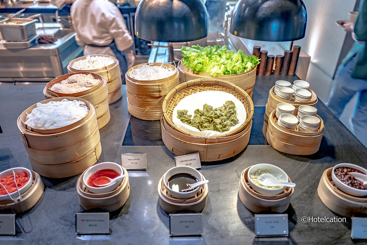 특히 다양한 면이 준비되어 있는 면 요리 코너나 직접 만든 딤섬이 포인트. 딸기를 포함한 다양한 과일도 제공되고 직접 만드는 다양한 생즙 주스도 제공된다.