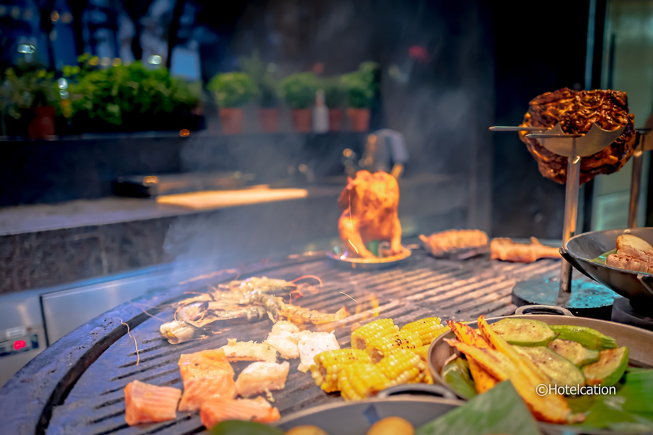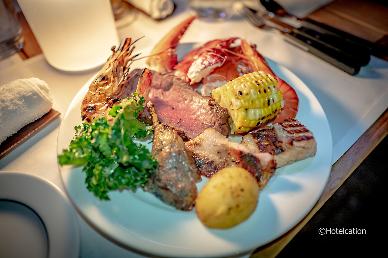 이 곳은 온수풀 바로 옆에 위치한 더 그릴이라는 풀 레스토랑이다. 특이하게도 그릴에 구워 나오는 바비큐 메뉴를 메인으로 하는 뷔페로 생각보다 저렴한 편. 즉석에서 다양한 재료들을 직접 구워주고 랍스터를 포함한 다양한 해산물과 각종 디저트, 음식이 뷔페 형식으로 제공된다.