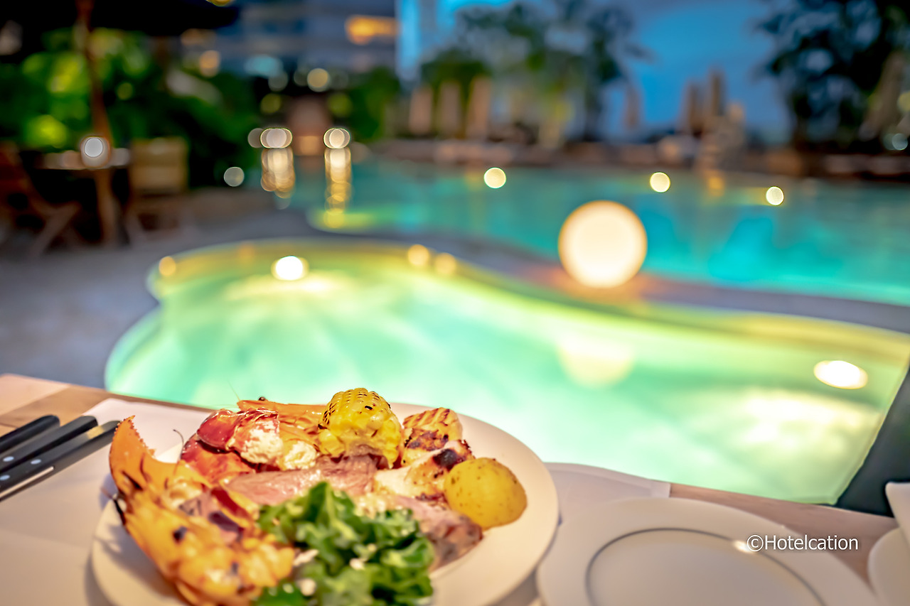 게다가 자리에서 보이는 아름다운 수영장 조명에 노을까지 더해져 특별한 경험을 선사한다.