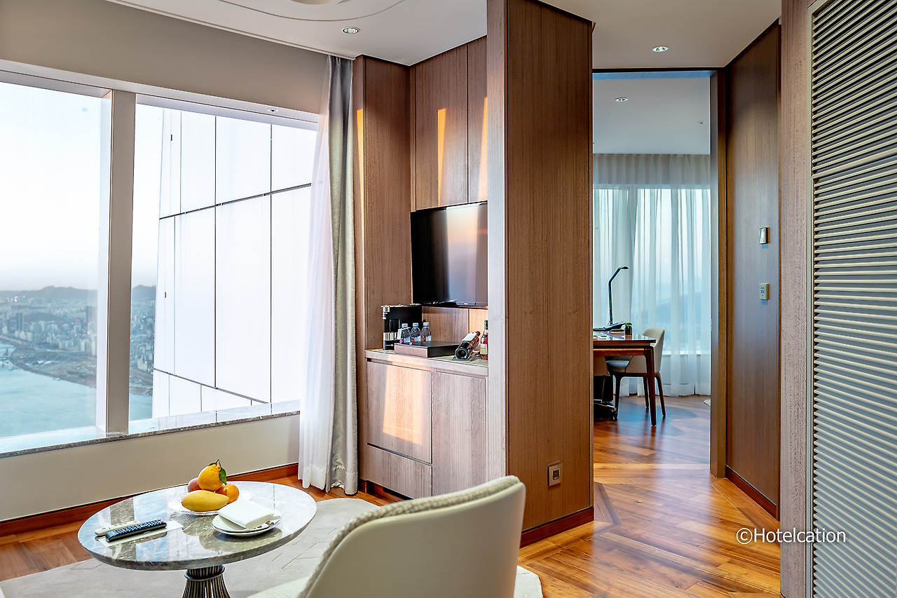 로비층에서 보이는 시원한 전망으로 시그니엘에서 호캉스가 시작된다. 직접 프론트에 서서 체크인 하는 것이 아니라 소파에 앉아서 편하게 체크인이 가능하다.